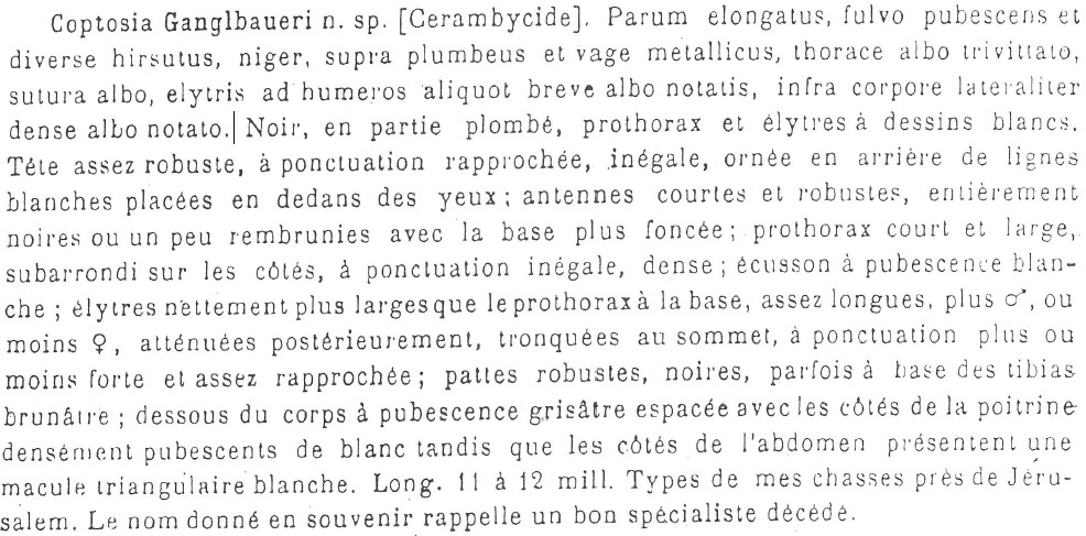 Coptosia Ganglbaueri n. sp. [Cerambycidae]. Trochu(?) podlouhlý, žlutě ochlupený a různorodě ochlupený, černý, supra plumbeus (olověný lesk?) a vage kovový, hruď bíle trivittato, šev bílý, krovky na ramenou krátce bíle notatis, spodek těla hustě bíle notato. Černý, částečně plombé (olověný lesk?), hruď a krovky s bílými vzory.