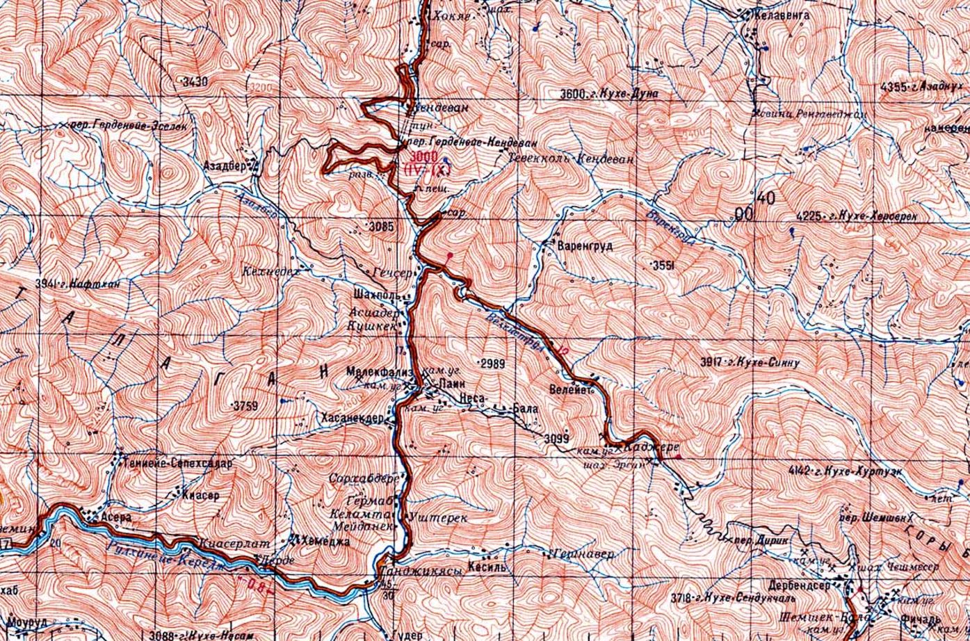 Myslím že to místo Marion našel správně, jen to už není v provincii Mazandaran, ale v sousední provincii Alborz. Tu řeku Венелетрул jsem ale nikde nenašel, možná se jedná o ten levostranný přítok řeky Varangeh Rud a snad hy se mohl jmenuje Velayat Rud, nebo jde o nějakou malou říčku, která na online mapách vůbec není. Tu vesnici Gachsar by asi angličan četl tak, jak je to foneticky přepsáno do azbuky (Gečser).