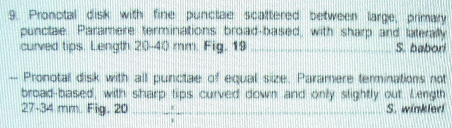 9. Disk (střed) štítu s dvojím tečkováním (mezi velkými tečkami jsou i tečky menší....). Popis tvaru paramer asi není třeba překládat, Ivo má tu práci a v ní jsou paramery nafoceny ze dvou stran....Velikost 20-40 mm..................................S. babori (S. = Scarabaeus)
