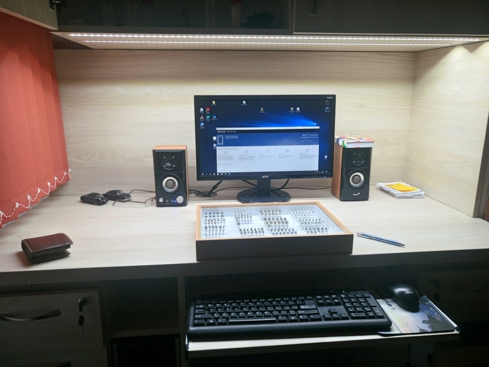 Mám hotovo. Místo na 80 krabic 30x40cm nad stolem. Jako osvětlení led pásky 12v (studená bílá) ovládané klasickým vypínačem na zdi. A do stolu jsem zakomponoval i výsuvné desky, jak poradil Marion - budou se určitě hodit. Tiskárna v prostoru nohou na plnovýsuvech ještě chybí, ale bude.
