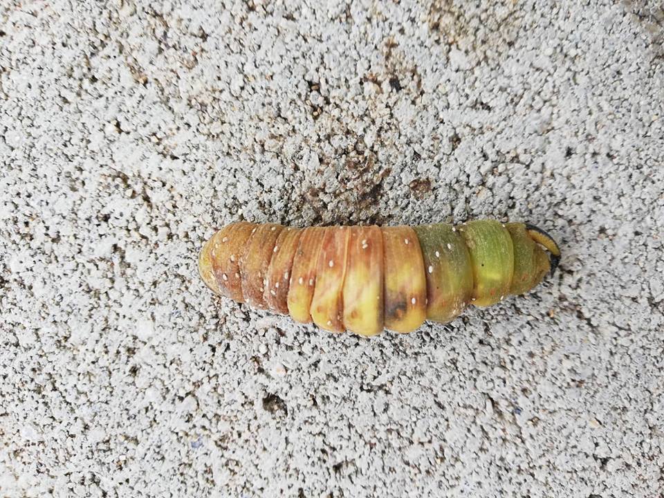 Jedná se o prepupu ( stádium housenky předcházející stádiu kukly ) nějakého lišaje. Housenka je již tak změněná, že nejde určit přesný druh. Původně barva byla zřejmě zelená ( lišaj šeříkový, svlačcový, lipový, topolový, paví oko ). Pravděpodobně lišaj topolový ( Laothoe populi ) nebo paví oko ( Smerinthus ocellatus ).