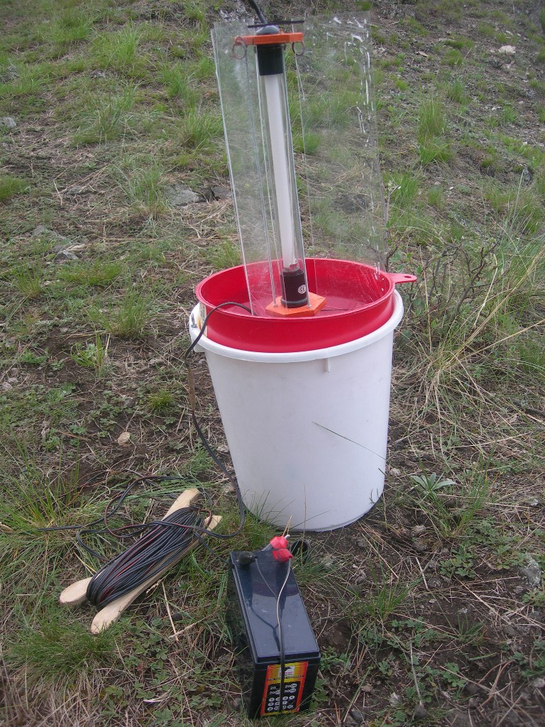 Zajdi si do Hornbachu a kup si velký plastový trychtýř. Pořiď si taky dvě plastové průhledné desky. Pak si pořiď montážní lampu (normální se zářivkou nebo UV) a olověný dvanáctivoltový akumulátor. Pak to sestav - do plastových desek udělej zářezy a zaraž je dohromady do kříže, to postav do trychtýře a trychtýř postav do kyblíku. Pověš na to montážní lampu. Pořizovací cena asi tak 1300 korun a nemusíš u toho být. Do kýble dáš skleničku s chloroformem, hmyz se do toho nachytá, nemůže vylézt a ještě se omámí. Ráno k tomu dorazíš, vše vybereš a co nechceš, to vyhodíš, je to jen omámené a oživne (pokud jsi tam ale chloroformu nedal moc, chce to cvik). Vypadá to takhle, tohle je lapač jednoho mého známého lepidopterologa, ale já jsem si pořídil totéž a nemohu si to vynachválit, každopádně nemám foto toho mého v přírodě: