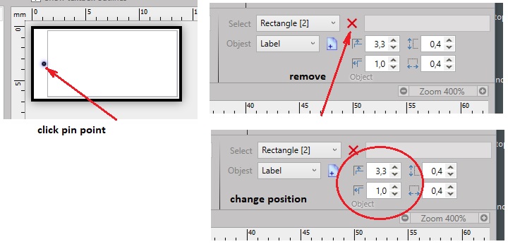 Click on pin point. Click remove (if you need remove it) or move its posiotion on label. See attached pictures.