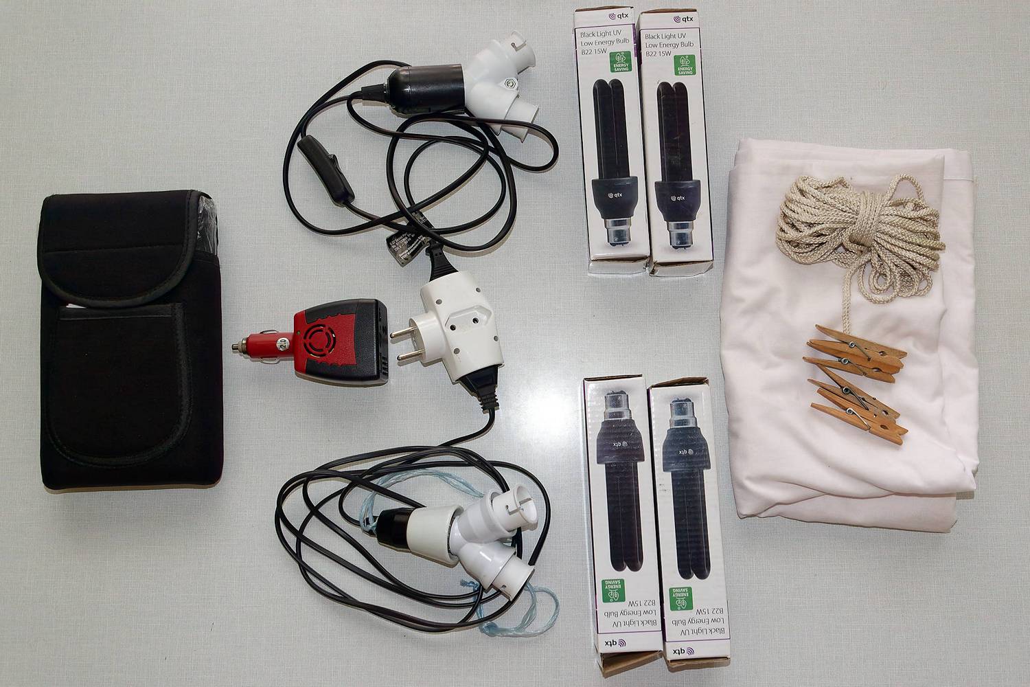 Od powerbanky, přes měnič, rozdvojku až k zářivkám a plátnu se šňůrou...