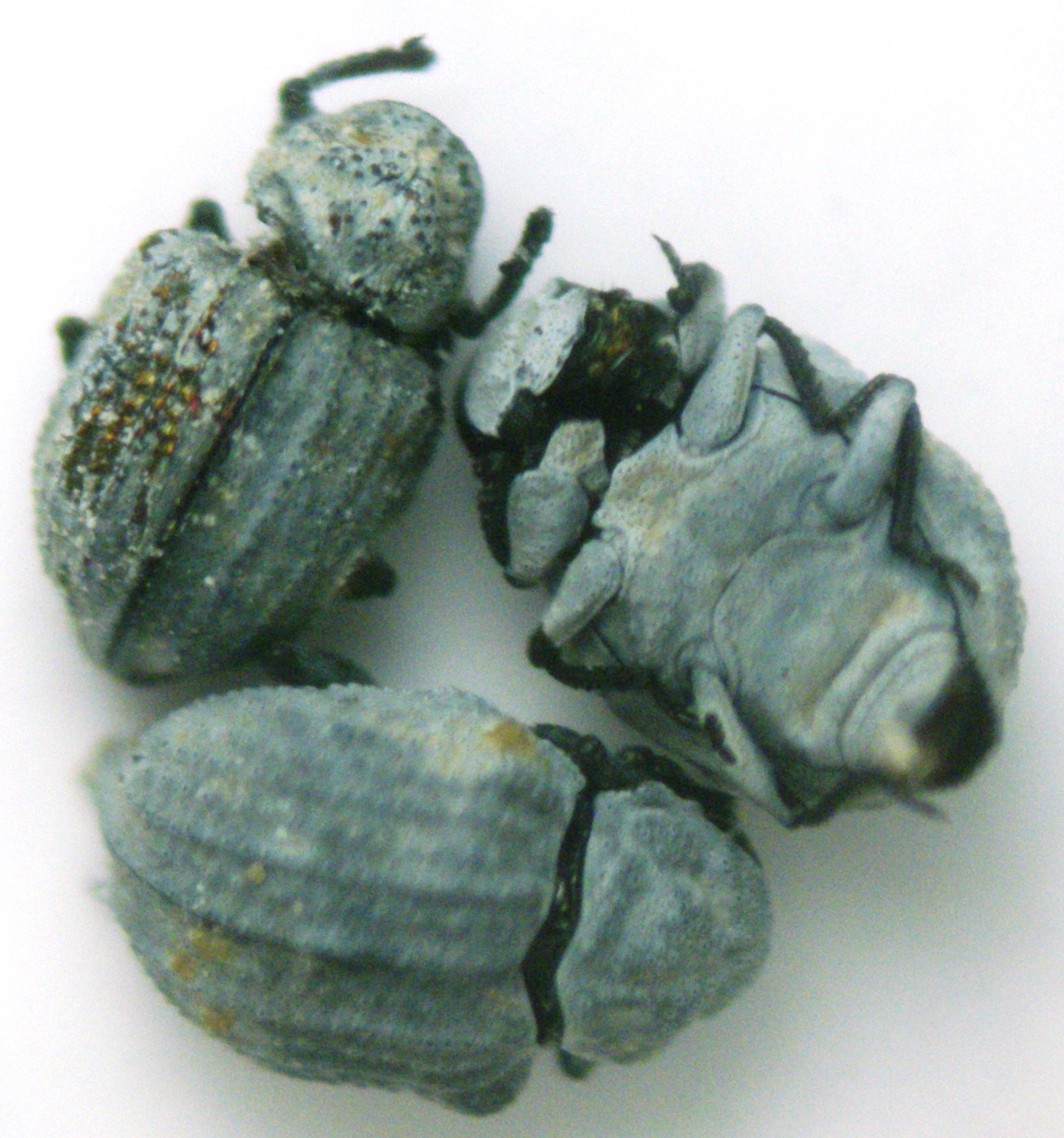Voskové šupinky - asi to bude různé, myslím, že jsou vůči otěru odolné - brouk žije vcelku dlouho. Nejsem chemik, ale mám pocit, že působení octanu (i jeho výparů) má za následek urychlení rozpouštění tuků v těle brouků. Pokud je takový brouk delší dobu vystaven působení octanu, začne se tuk uvnitř těla uvolňovat a prosakovat skrz krovky a pak voskové šupinky zanikají. Pokud se působení octanu vystaví málo nebo zabije jiným způsobem (mrazák, čpavek), je to lepší, ale ke zmatnění nebo vymizení bílých šupinek může dojít i řadu let po preparaci. Je běžné, že mnoho let po preparaci, zvlášť u dochovaných brouků, se začne tuk uvolňovat a tvořit novotvary na povrchu brouka a také samozřejmě přes sternity začne promašťovat štítek. S sebou bere i různá v tuku rozpustná žlutá barviva. Jejich odstraňování z povrchu brouka je problém, pokud člověk nechce brouka máčet v benzínu. Jde to měkkým štětečkem toto sádlo odprýsknout, ale musí se dávat bacha na depilaci :S